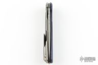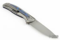 This Hati Gen3 by Shirogorov Knives features a drop point blade with notched thumbrest and flipper. The handle has Blue Techno Carbo and titanium frame with Blue Techno Carbo inlay, titanium tip up clip with hidden screws, titanium backspacer with lanyard hole. Rides on bearings, nice detent, lockup and blade seating. Comes with COA and original box. Excellent condition.
