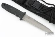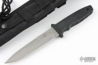 This Terzuola designed M-30A1 fixed blade has a bead blasted ATS-34 spear point blade with false top edge, notched spine, and hidden tang. 3/16" blade stock, 1-1/8" depth. Handle is "knurled" Zytel with lanyard hole. Excellent condition. Comes with a black nylon sheath. Has some minor scuffs, otherwise excellent condition.
