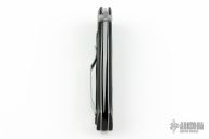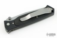 This Vallotton Chameleon D/A by Timberline Knives has a bead blasted partially serrated blade with dual thumb studs and notched thumbrest. Handle is black FRN composite scales with rubber inlay, stainless steel liners and tip up clip. Has some light scratches, otherwise excellent condition. Comes with original box. The hidden button is under the front rubber scale.