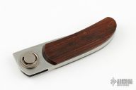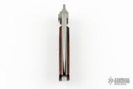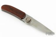 This Paul knife by Gerber has an axial locking mechanism. Has wood scales with a stainless steel frame. Has some scratches, has a little blade play, otherwise good condition. Comes with original box.
