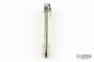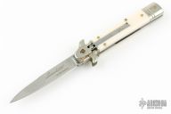 This Leverletto Lever Lock Auto has a mirror polished stainless steel spear point blade. The handle has white scales, fluted nickel silver front and rear bolsters, stainless steel liners and back spacer, and nickel silver lock release button. Has a few light scratches, otherwise excellent condition.