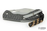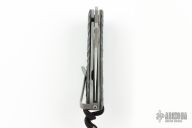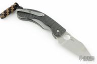This Perrin PPT from Spyderco has a satin finished CPM S90V stainless steel drop point blade with thumb hole and notched thumb rest. Handle is carbon fiber over bead blasted stainless steel liners and backspacer. Bead blast stainless steel tip up clip. New condition. Includes original box and papers. Discontinued.