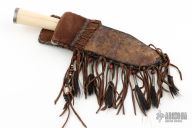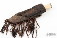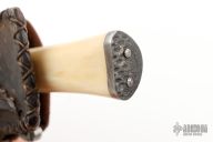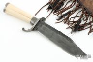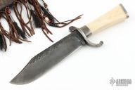 This Bowie by Master Smith Daniel Winkler features a forged blade with hammer marked flats and visible temper line, .282" blade stock and 1.610" blade depth, hidden tang construction. The handle has a forged steel guard and bone grip with forged steel butt. Comes with a rawhide leather sheath. Has a crack running the length of the grip, has a couple light scratches, otherwise excellent condition.