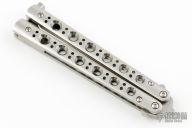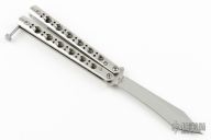 This Model 67 Balisong by Benchmade features a tumble finished tanto recurve blade and stainless handles with T-latch. Nice and tight. Comes with benchmade drawstring pouch and nylon belt sheath. Has a couple light scratches, excellent condition otherwise.