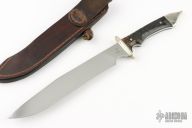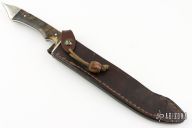 This Mercenary from Shiva Ki features a nearly mirror polished recurve blade, .187" blade stock and 1.422" blade depth, full tang construction. The handle has a nickel silver guard and rear bolsters with sheep horn scales. Includes a brown leather sheath with belt loop. Has some scratches, otherwise excellent condition.