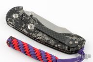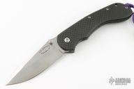 This framelock by Steven Kelly features a satin finished blade with dual thumbstuds. The handle has a carbon fiber and laser engraved titanium frame with tip up carbon fiber clip, anodized titanium barrel spacers. Comes with zippered case and coa. Nice detent, lockup and blade seating. Excellent Condition.