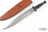 This knife by Shiva Ki features a double edged recurve Samurai Steel blade with hamon, .182" blade stock and 1.737" blade depth, hidden takedown tang construction. The handle has a black Kraton grip with black butt that unscrews to remove the handle. Comes with a custom brown leather sheath with alligator inlays by Paul Long. Has a couple light scratches, and two small dings in the top edge, has a split in the handle near the guard, otherwise excellent condition.