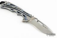 The Nirk Tighe design by Brian Tighe and Glenn Klecker won Blade Magazine's "Most Innovative Design" award for 2010. This flipper by Brian Tighe features a fluted satin finish blade and a machined skeletonized titanium frame with anodized reliefs. The knife uses Glenn Klecker's lockback mechanism - pressing the base of the spine will release the lock. Includes a padded zippered case.  Excellent Condition.