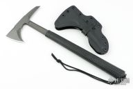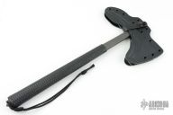 What sets the Shrike apart from other tools is the insulated rubber over-molded handle. The advantage of such a design is not only a great grip but vibration reduction and that fact that the handle is insulated. The Shrike has been tested to provide insulation up to 2,000 volts. If the tool is being used to chop through a wall and happens to connect with a live electrical wire, a good degree of protection exists from getting electrocuted. The butt end of the grip features a cap that screws off to gain access to a small storage compartment. We do sell a sharpening file that will fit the butt-cap, HERE The ax features a Tungsten Cerakote finish for corrosion and wear resistance and a low visibility look. Included is a molded, bottom-eject kydex sheath and low-ride M.O.C. straps.
