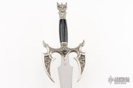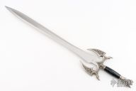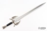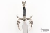 Kit Rae, well-known fantasy artist and weapon designer, crafted Kilgorin, a high quality sword from his epic mythological tale "The Tale of the Swords of the Ancients and Other Blades of Power", and at your request, he is reissuing it! Kilgorin, the Sword of Darkness, was the second of the ten mighty swords forged with special and unique powers to maintain order and harmony in the fantasy world of Ammon. Kilgorin possessed the power to give its wielder the ability to cast darkness and enchantment over enemies. Measuring 36" overall, this sword features an intricately detailed and distinctive cast metal pommel and guard with an antique silver finish. The 25 1/2" blade is satin-finished, 3Cr13 stainless steel with a deep etched runic design.