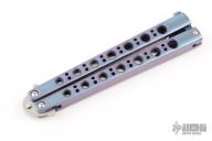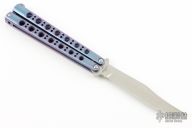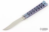 This Model-43 by Benchmade features a tumble finished clip point blade with false top edge. The handles are orange peel finished and anodized titanium with a T-latch. Comes with a original box and papers. Excellent condition.