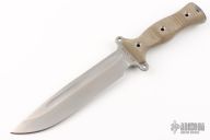 This Team Gemini Light Brigade by Busse Combat Knife Company features a drop point competition finished blade with fullers, .221" blade stock and 1.600" blade depth. The handle has green canvas micarta scales over full tang construction. Exposed tang pommel with lanyard hole. New from maker.