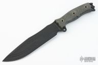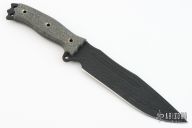 This Hell Razor 2 from Busse features a black coated blade with fullers and black canvas micarta scales, .216" blade thickness and 1.769" blade depth, full tang construction. Has large fullers on blade and corrugated bevel technology. New from maker!