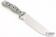 This Camp Tac 7 by Busse Combat features a satin finished blade with sawteeth, .219" blade stock and 1.715" blade depth, full tang construction. The handle has black/tan G-10 scales. New from maker.