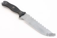This Camp Tac 7 by Busse Combat features a stonewashed finished blade with sawteeth, .219" blade stock and 1.715" blade depth, full tang construction. The handle has black G-10 scales. New from maker.