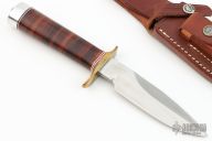 This Combat Companion by Randall Made Knives features a satin finished blade with sharpened top edge, .226" blade stock and 1.150" blade depth, full tang construction. The handle has a brass double guard, stacked leather grip with red/white/blue spacers and a duralumin butt. The Combat Companion is one of Randall's non-catalog knives. Includes a brown leather sheath. Has a little patina on the guard, otherwise excellent condition.