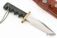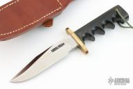 This is a miniature version of Randall's Model 14 Attack. The Model 14 was designed to meet the demand for an almost indestructible all-purpose knife, though it is especially suited for combat and survival purposes. #316. Satin finished blade with sharpened top edge, .172" blade stock and .812" blade depth, full tang construction. The handle has a brass guard and black linen micarta grip, lanyard hole at the butt. Knife is in excellent condition. Comes with original brown leather sheath.