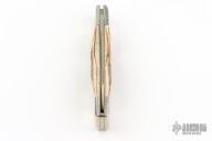 This slipjoint by Schatt and Morgan features a satin finished blade with nail nick. The handle features nickel silver bolsters, brass liners and stag covers. Stainless steel springs. Has scratches, otherwise good condition.