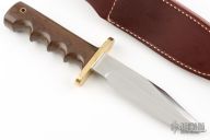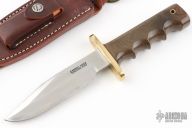 This Model 15 Airman by Randall Made Knives features a clip point blade with a sharpened top edge, .221" blade stock. 1.253" blade depth, full tang construction. The handle has green linen micarta handle with finger grips and a brass guard. The Model 15 is designed especially for heavy-duty use and to be as nearly indestructible as possible. Comes with a brown leather sheath. Excellent condition.