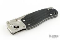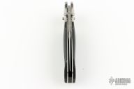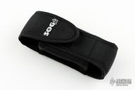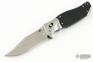 This SOG TomCat Axis Lock Folder has a VG-10 blade with dual thumb studs and a notched thumbrest. Handle is black rubber with satin finished stainless steel bolsters over stainless steel frame with notched thumb rest and black fiber back spacer. Has lanyard tube pin. Comes with SOG nylon velco sheath, original box and papers. Excellent condition. Still has plastic covers on the bolsters.