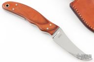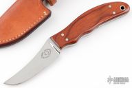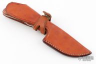 This knife by Chubby Hueske features a mirror polished blade, .176" blade stock and .999" blade depth, full tapered tang construction. The handle has dymondwood scales with black liners. Comes with a brown leather sheath. Excellent condition.