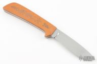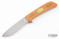 This knife by Chubby Hueske features a mirror polished blade, .172" blade stock and .904" blade depth, full tang construction. The handle has yellow paper micarta scales with an engraved brass escutcheon, black and brass liners. The scales have scrimshaw. Has some scratches, otherwise good condition.