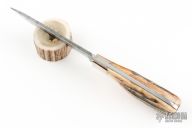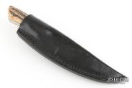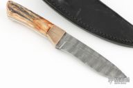 This knife by TD Bennett features a Damascus blade with .168" blade stock and 1.216" blade depth, full tang construction. The handle has mokume dovetailed bolsters, stag scales. Comes with a black leather sheath. Excellent condition.