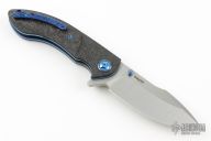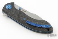 This Orca flipper by MassDrop is an Eric Ochs design. It features a satin finish blade with dual thumbstuds and notched flipper. The handle has mokuti pivot collars, milled and textured carbon fiber scales, anodized titanium liners, carbonfiber backspacer, mokuti clip with hidden screws. Comes with original box and zippered case. Excellent condition.