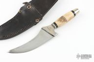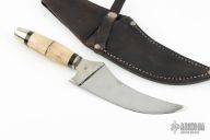 This knife by "JML" (please let us know if you know who this is) features a mirror polished balde with .184" blade stock and 1.968" blade depth, hidden tang construction. The handle has nickel silver bolsters, nickel silver guard and butt, stag grip with red/white/black spacers. Comes with a black leather sheath. has some scratches and light pitting, otherwise good condition for its age.