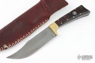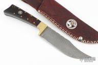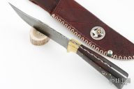 This knife by Roy Hill features a Damascus blade with fileworked spine and tang, .132" blade stock and 1.629" blade depth, full tang construction. The handle has brass bolsters with desert ironwood burl scales with brass pins. Comes with a hand tooled brown leather sheath. Has a small ding in the blade edge, otherwise excellent condition.