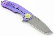 This F3 Medium by Curtiss Knives features a bead blasted Magnacut blade with notched thumbrest. The handle has an anodized and bead blast finished frag-milled titanium frame over notched titanium backspacer, matching titanium tip up clip. Smooth and fast opening using a Caged Bearing System. Nice blade seating, detent and lock up. Includes the original box and papers.  Excellent Condition.
