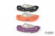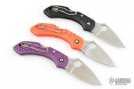 These three Spyderco's feature satin finished blades with thumbhole and notched thumbrest. The handles have FRN scales, stainless steel backspacers, and a tip up clip, left or right reversible. All come with original box and papers. Excellent condition.