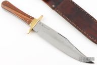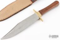 This bowie by Ray Warren features a satin finished blade with false top edge, .230" blade stock and 1.455" blade depth, full tang construction. The handle has a brass guard, wood scales with brass pins. Comes with a brown leather sheath. Has some light scratches, otherwise good condition.