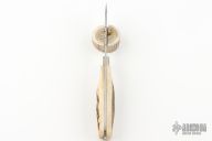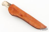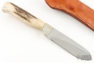 This knife by TD Bennett features a mirror polished blade with fileworked spine, .122" blade stock and 1.092" blade depth, full tang construction. The handle has dovetailed nickel silver bolsters, stag scales with nickel silver pins. Comes with a brown leather sheath. Has a few light scratches, otherwise excellent condition.