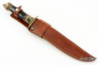 This collector's knife from Othello is #1354 of 5000 made in Solingen, Gemany. Features mirror polish blade with "Golden Bear" engraving. Blade is 1/4" thick and 1 1/4" deep. Brass guard and pommel feature heads of a bear, black linen micarta grip. Comes with a brown leather sheath. Has a couple small oxidation spots, otherwise excellent condition.