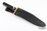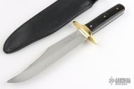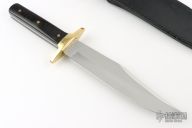 This Bowie by Craig Garrison features a mirror polished blade with false top edge, .157" blade stock and 1.554" blade depth, full tang construction. The handle has a brass guard, black paper micarta scales with brass pins and brown liners. Comes with a black leather sheath. Has some light scratches, otherwise excellent condition.