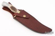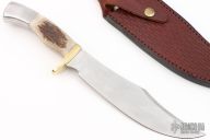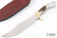 This Bowie features a satin finished blade with false top edge, .159" blade stock and 1.720" blade depth, full tang construction. The handle has a brass guard, stag scales with brass pins, aluminum bolsters. Comes with a hand tooled brown leather sheath. Has some light scratches and a couple dings on the rear bolsters, otherwise good condition.