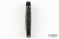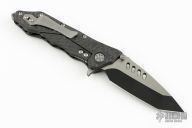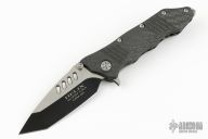This framelock flipper features a two tone blade with satin flats and black grinds, dual thumbstuds, flipper, and notched thumbrest. The handle has a carbon fiber frame, bead blast stainless steel backspacer and tip up clip. Nice detent, lockup and blade seating. Includes original box, drawstring pouch and papers. Knife is in excellent condition. #0649CF on clip.