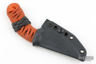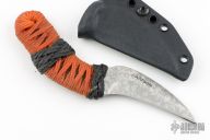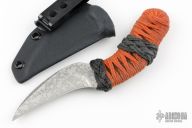 This knife by Joe Watson features an acid etch, zeno grind hawkbill blade with .106" blade stock and 1.077" blade depth, full tang construction. The handle has dark orange cord wrap over black cord under wrap. Center swell/guard Turk's head knots. Comes with a kydex sheath, bag, and info card. New from maker!