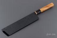 This custom Chef by Rick Barrett features a Stainless Damascus blade with VG-10 core, hidden tang construction, .79" Blade Stock and 1.825" Blade Depth. The handle features a Mokume ferrule with African Blackwood and Olive handles. Comes with a plastic blade guard. Very cool! New from maker!