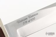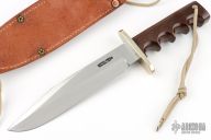 This Model 14 by Randall Made Knives features a satin finished stainless steel blade with sharpened top edge, .229" blade stock and 1.408" blade depth, full tang construction. The handle has a nickel silver guard, brown canvas micarta finger grip handle with lanyard hole. 500 pieces of this limited edition version of the Model 14 were made. Marked "Vietnam Veteran" and numbered 078 of 500 on back of blade. Comes with a zippered case marked Vietnam Veteran and brown leather sheath. Excellent condition.