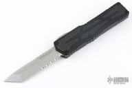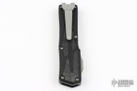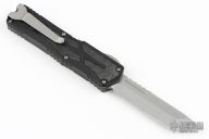 This Colossus by Heretic Knives features a stonewashed partially serrated tanto blade with fullers and notched thumbrest. The handle has a black aluminum frame with non-slip inlays, checkered thumb slide, stainless steel tip down clip. Comes with original box and lube. S/N 01528. Excellent Condition.