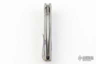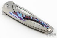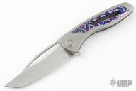This Apex Flipper from Brian Nadeau features a Damasteel blade with a thumbhole, flipper and notched thumbrest. The handle has a bead blasted titanium frame with timascus inlays, satin titanium tip up clip. Rides on bearings, nice detent, lockup and blade seating, stainless lockface insert. Comes with original box. Excellent Condition.