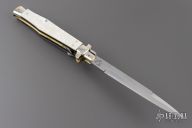 This Picklock Auto by Renzo Passcotto features a finished blade with unsharpened edges. The handle has mother of pearl scales with black liners, brass D-stamp liners and nickel silver bolsters. Has safety. Has some light scratches, otherwise excellent condition.