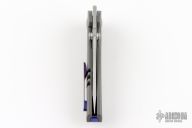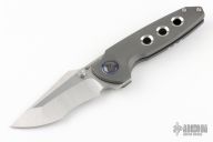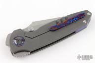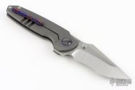 This Manticore by Maxace features a satin finished blade with notched flipper. The handle has a bead blasted titanium frame with timascus pivot collars, tip up clip, backspacer and bead blast finished hardware. Comes with original box, zipper case, and papers. Excellent condition.