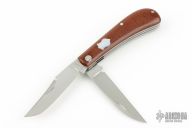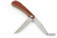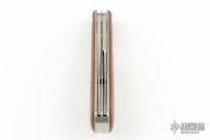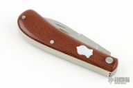 This Slipjoint by Ricardo Romano features 2 hand rub satin finished blades with nail nicks. The handle has brown canvas micarta covers with a mother of pearl escutcheon and white liners, stainless steel liners and springs. Fileworked liners and springs. Has half-stops, flush in all positions. Excellent condition.