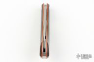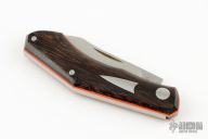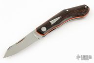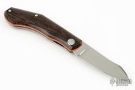This Slipjoint by Ricardo Romano features a hand rub satin finished blade with nail nick. The handle has cross cut black canvas micarta covers with stainless steel escutcheon and orange G-10 liners, stainless steel liners and spring. Has half-stop, flush in all positions. Excellent condition.