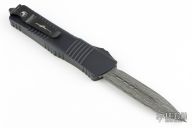 This Combat Troodon by Microtech Knives features a Damascus double-edged blade. The handle is black aluminum and carbon fiber, ringed anodized titanium screws, and a black stainless steel pocket clip. The handle is marked "A. Marfione" and dated 05/2021 and #087 on spine of handle and claw logo. Excellent work. Comes with original box and papers. Excellent condition.