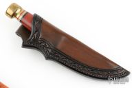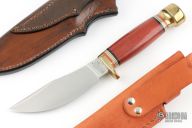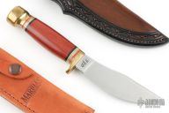This Woodcraft by Marbles features a clip point satin finished blade with notched thumbrest, .186" blade stock, 1.236" blade depth, hidden tang construction. The handle has a brass guard and butt, bloodwood grip, black/brass/white/red spacers. Includes original box. Comes with original brown leather and a custom hand tooled brown leather sheath. Excellent condition.