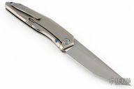 The Cybernetic is a svelte folding knife that has classy, clean lines. The blade is a mix of standard and tanto styles with a very subtle secondary cutting edge. Deployment is accomplished with the minimal, yet effective front flipper tab. The titanium handle is sans fasteners on the show side and sports a framelock with steel lockbar insert and a milled pocket clip on the back side. We recommend the Cybernetic for the discerning knife collector with a taste for understated elegance.